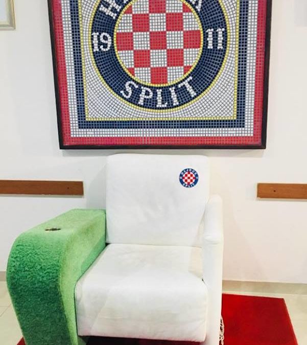 Dieser Fußballtorstuhl steht in den heiligen Hallen des Fußballclubs Hajduk Split – und wir haben bei einem exklusiven Besuch im nichtöffentlichen Bereich des Spliter Stadions – wegen seiner Form auch Muschel (kroatisch: skoljka, gespr. Schkolljka) genannt – ebendort Platz genommen …